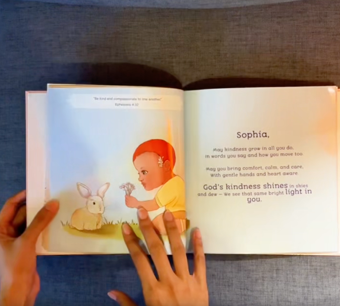 Me and my husband chose this for our newborn because the prayers are so beautiful and soft. I love that we could customize everything… the baby in the book actually looks like our little one. It’s a keepsake they’ll open again when she’s older.
